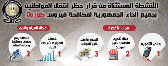 نشر المركز الإعلامي لمجلس الوزراء، إنفوجرافاً سلط من خلاله الضوء على الأنشطة المستثناة من قرار حظر انتقال المواطنين بجميع أنحاء الجمهورية لمكافحة فيروس “كورونا”.