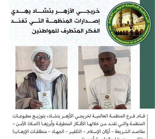 The branch of the World Organization for al-Azhar Graduates in Chad distributed the organization’s publications, which refuted the extremist thoughts to the citizens in a mosque in the capital N’Djamena. Most notably, the safe haven, Objectives of Shariah, Islam pillars, Takfir, Jihad), in the presence of 40 persons.