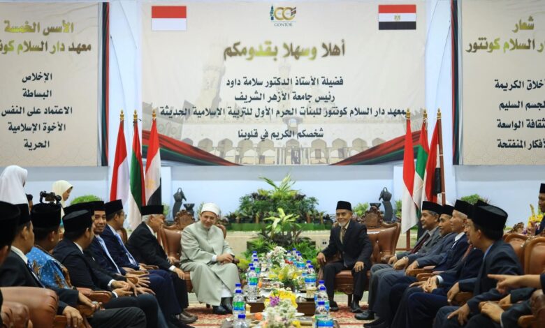 Prof. Salama Dawood, President of al-Azhar University and Vice-President of the World Organization for al-Azhar Graduates concluded his trip to Indonesia by visiting Dar al-Salam Kuntur Institute, East Java. His Eminence was received by the Institute’s leadership headed by the esteemed: Sheikh Hassan Abdullah Sahl, Dr. Amal Zarkashi and Dr. Hamid Fahmy Zarkashi, the Institute’s President. The reception ceremony began with the recitation of the Holy Quran and the playing of the national anthems of both Egypt and Indonesia. Prof. Dawood was given a brief on the Institute, established in 1926 and will be celebrating its 100th anniversary next year. Additionally, the Institute had been honored by the visits of a number of al-Azhar most significant and prominent figures, including Prof. Ahmad at-Tayyeb, the Grand Imam of al-Azhar, Sheikh Mahmoud Shaltoot, Prof. Abdul Halim Mahmoud, Sheikh Gad al-Haq Ali Gad al-Haq and Prof. Mohammad Sayed Tantawi. The Institute’s leadership affirmed that its students are studying the Azhari curricula and consider al-Azhar ash-Sharif as their foremost religious reference.