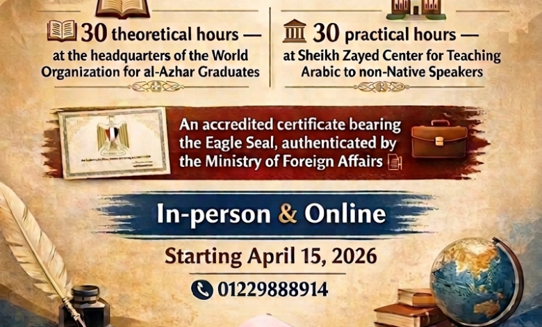 - In-person attendance: the theoretical component will be held at the headquarters of the World Organization for al-Azhar Graduates, while the practical component will be at Sheikh Zayed Center for Teaching Arabic to non-Native Speakers.